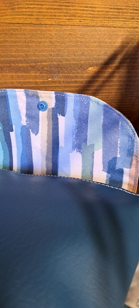 This small camera style bag has a snap fastening on the flap, an inner patch pocket and cotton canvas coordinating strap. Made from pvc coated cotton oilcloth and waterproof vinyl fabric then finished with topstitching detail.