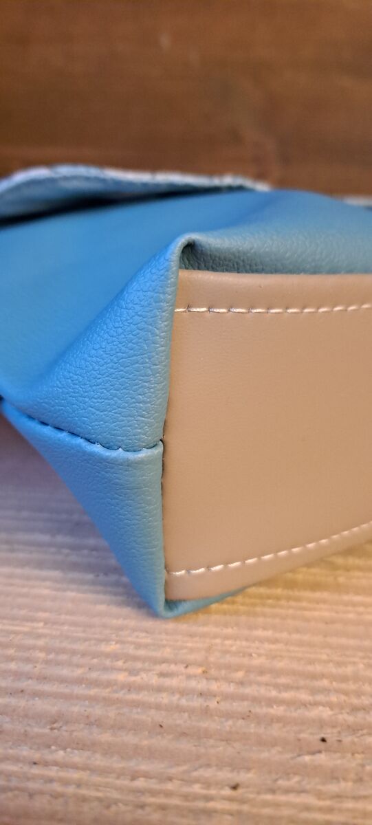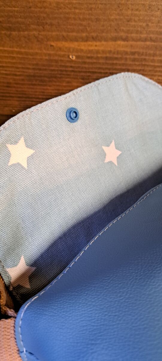 This small camera style bag has a snap fastening on the flap, an inner patch pocket and cotton canvas coordinating strap. Made from pvc coated cotton oilcloth and waterproof vinyl fabric then finished with topstitching detail.