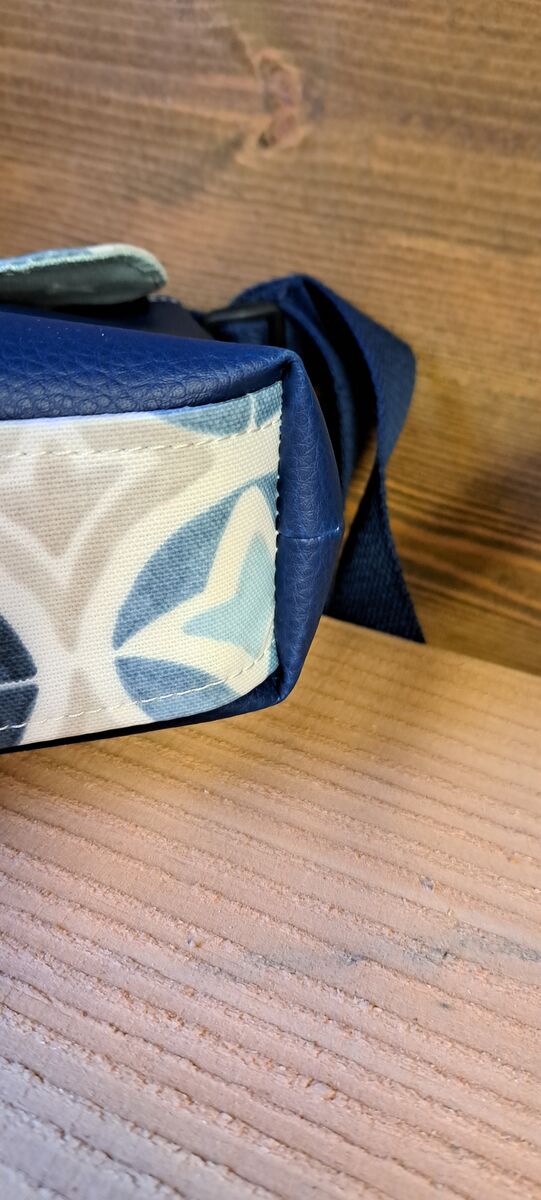 This small camera style bag has a snap fastening on the flap, an inner patch pocket and cotton canvas coordinating strap. Made from pvc coated cotton oilcloth and waterproof vinyl fabric then finished with topstitching detail.