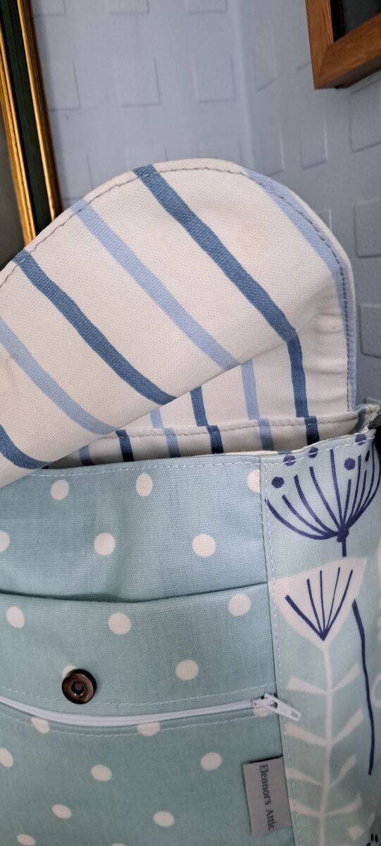 Our updated bestselling design, the Reporter is the perfect choice for an everyday handbag. Made from durable wipe clean oilcloth/vinyl , the Reporter is a medium sized cross-body bag with an interior pocket, reinforced magnetic fastening and an adjustable strap. It's fully lined with a co-ordinating fabric and then finished with a subtle white top-stitch and our signature Eleanor's Attic swing tag. This new design also features a zipped pocket on the front and vertical oilcloth stripes. All of our items are handmade in Wales.